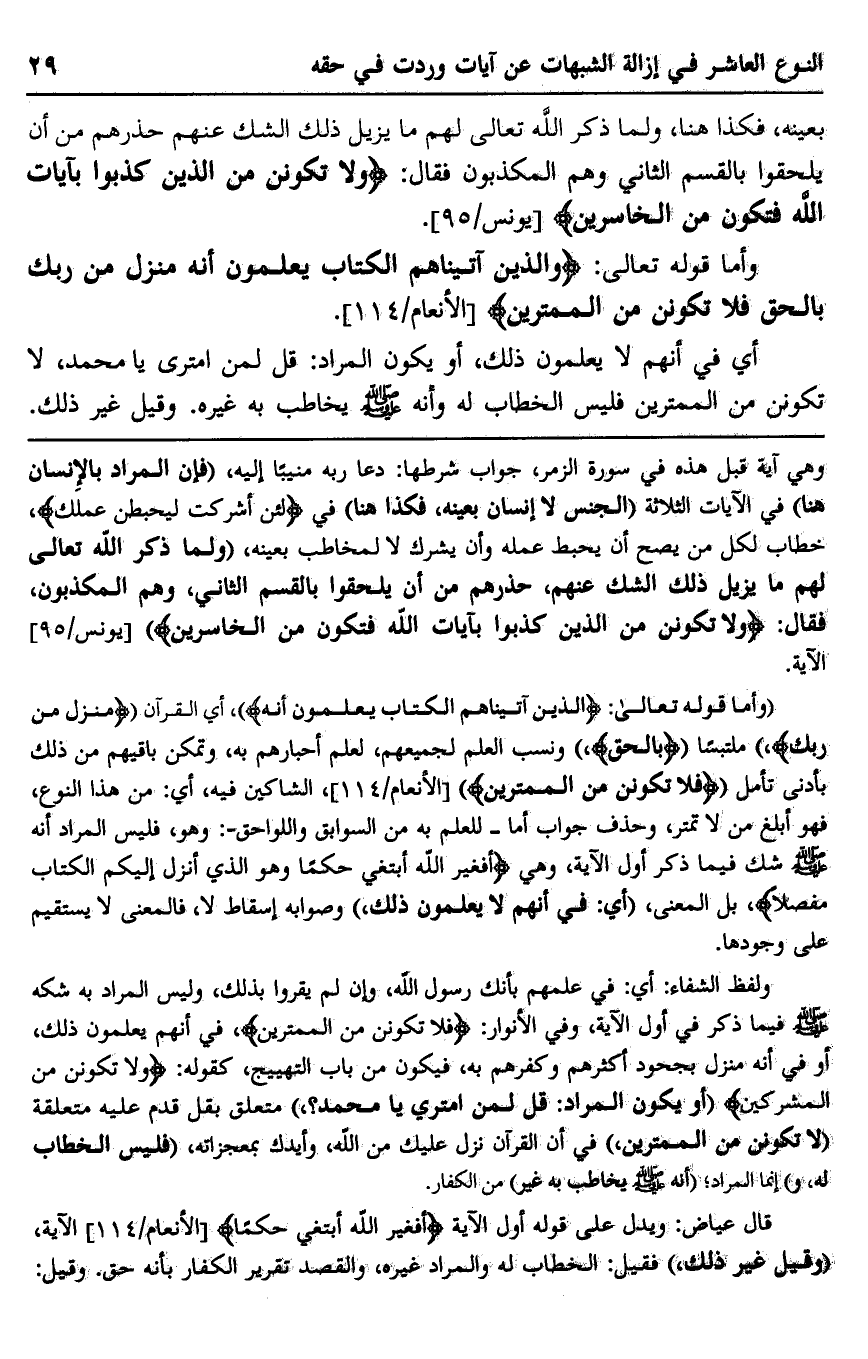 وأما قوله تعالى: {وَالَّذِينَ آَتَيْنَاهُمُ الْكِتَابَ يَعْلَمُونَ أَنَّهُ} أي القرآن {مُنَزَّلٌ مِنْ رَبِّكَ} ملتبسًا {بِالْحَقِّ} ونسب العلم لجميعهم لعلهم أحبارهم به، وتمكن باقيهم من ذلك بأدنى تأمل {فَلَا تَكُونَنَّ مِنَ الْمُمْتَرِينَ} [الأنعام: 114] ، الشاكين فيه، أي: من هذا النوع، فهو أبلغ من لا تمتر، وحذف جواب أما - للعلم به من السوابق واللواحق: وهو، فليس المراد أنه صلى الله عليه وسلم شك فليما ذكر أول الآية، وهي {فَغَيْرَ اللَّهِ أَبْتَغِي حَكَمًا وَهُوَ الَّذِي أَنْزَلَ إِلَيْكُمُ الْكِتَابَ مُفَصَّلًا} بل المعنى، "أي: في أنهم لا يعلمون ذلك" وصوابه إسقاط لا، فالمعنى لا يستقيم على وجودها.