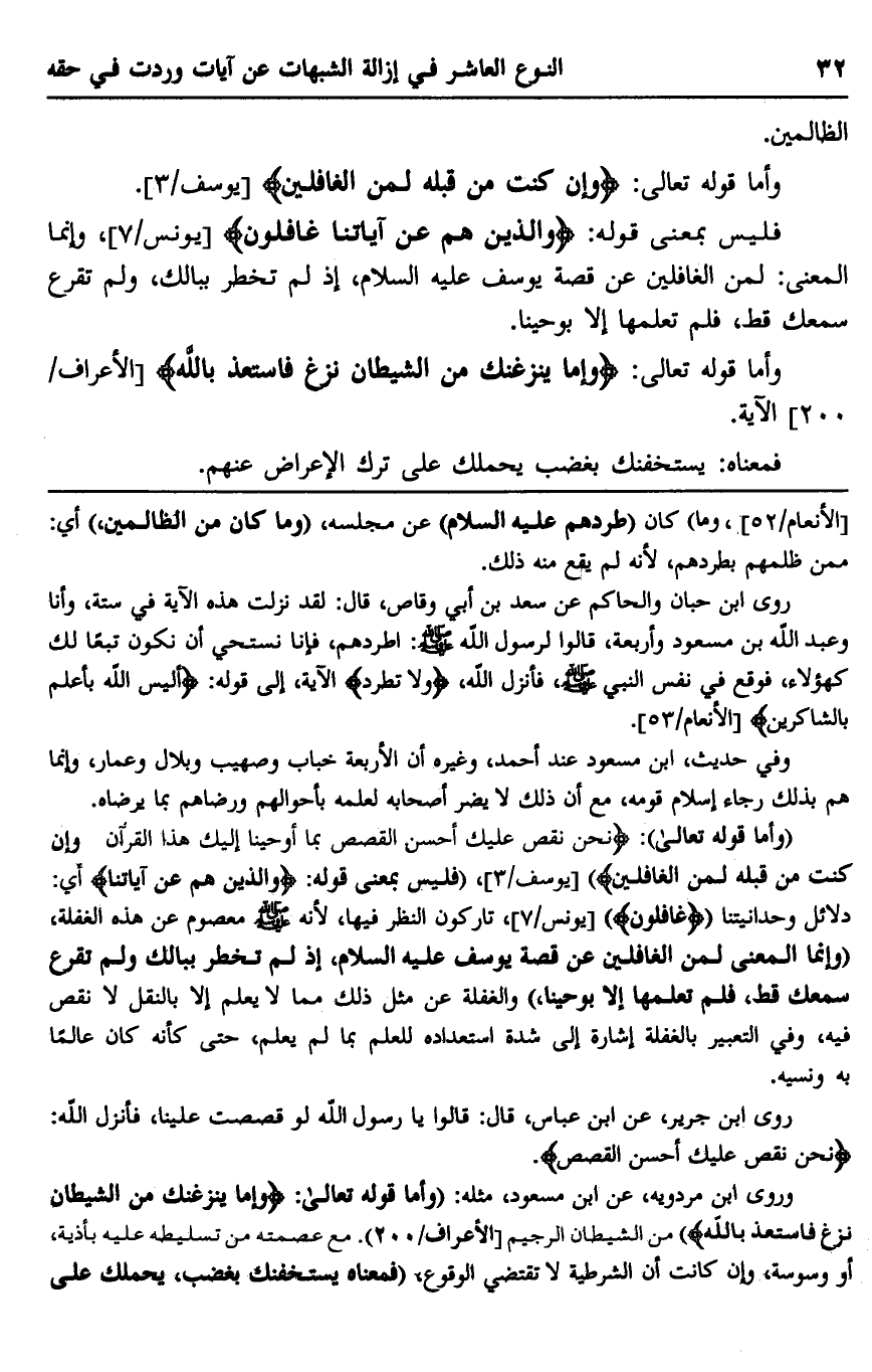وأما قوله تعالى: {نَحْنُ نَقُصُّ عَلَيْكَ أَحْسَنَ الْقَصَصِ بِمَا أَوْحَيْنَا إِلَيْكَ هَذَا الْقُرْآَنَ وَإِنْ كُنْتَ مِنْ قَبْلِهِ لَمِنَ الْغَافِلِينَ} [يوسف: 3] ، "فليس بمعنى قوله: {وَالَّذِينَ هُمْ عَنْ آَيَاتِنَا} أي: دلائل وحدانيتنا {غَافِلُونَ} [يونس: 7] ، تاركون النظر فيها، لأنه صلى الله عليه وسلم معصوم عن هذه الغفلة، "وغنما المعنى لمن الغافلين عن قصة يوسف عليه السلام، إذ لم تخطر ببالك ولم تقرع سمعك قط، فلم تعلمها إلا بوحينا" والغفلة عن مثل ذلك مما لا يعلم إلا بالنقل لا نقص فيه، وفي التعبير بالغفلة إشارة إلى شدة استعداده للعلم بما لم يعلم، حتى كأنه كان عالمًا به ونسيه.