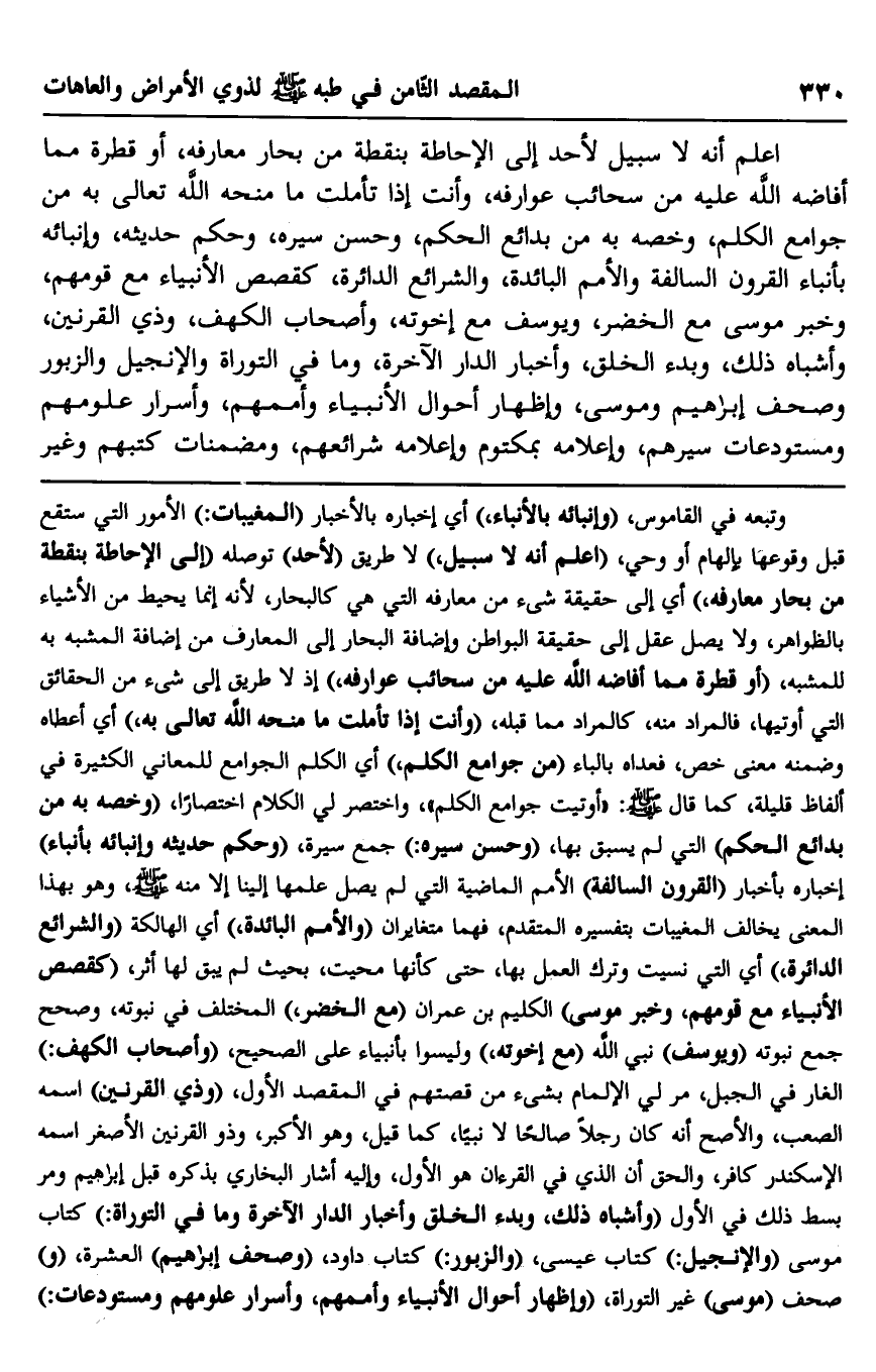 وتبعه في القاموس، "وإنبائه بالأنبياء" أي إخباره بالأخبار "المغيبات" الأمور التي ستقع قبل وقوعها بإلهام أو وحي، "اعلم أنه لا سبيل" لا طريق "لأحد" توصله "إلى الإحاطة بنقطة من بحار معارفه" أي إلى حقيقة شيء من معارفه التي هي كالبحار؛ لأنه إنما يحيط من الأشياء بالظواهر، ولا يصل عقل إلى حقيقة البواطن وإضافة البحار إلى المعارف من إضافة المشبه به للمشبه، "أو قطرة مما أفاضه الله عليه من سحائب عوارفه" إذ لا طريق إلى شيء من الحقائق التي أوتيها، فالمراد منه، كالمراد مما قبله، "وأنت إذا تأملت ما منحه الله تعالى به" أي أعطاه وضمنه معنى خص، فعداه بالباء "من جوامع الكلم" أي الكلم الجوامع للمعاني الكثيرة في ألفاظ قليلة، كما قال صلى الله عليه وسلم: "أوتيت جوامع الكلم" واختصر لي الكلام اختصارًا، "وخصه به من بدائع الحكم" التي لم يسبق بها، "وحسن سيره" جمع سيرة، "وحكم حديثه وإنبائه بأنباء" إخباره بأخبار "القرون السالفة" الأمم الماضية التي لم يصل علمها إلينا إلا منه صلى الله عليه وسلم، وهو بهذا المعنى يخالف المغيبات بتفسيره المتقدم، فهما متغايران "والأمم البائدة" أي الهالكة "والشرائع الدائرة" أي التي نسيت وترك العمل بها، حتى كأنها محيت، بحيث لم يبق لها أثر، "كقصص الأنبياء مع قومهم، وخبر موسى" الكليم بن عمران "مع الخضر" المختلف في نبوته، وصحح جمع نبوته "ويوسف" نبي الله "مع إخوته" وليسوا بأنبياء على الصحيح، "وأصحاب الكهف" الغار في الجبل، مر لي الإلمام بشيء من قصتهم في المقصد الأول، "وذي القرنين" اسمه الصعب، والأصح أنه كان رجلًا صالحًا لا نبيًّا، كما قيل: وهو الأكبر، وذو القرنين الأصغر اسمه الإسكندر كافر، والحق أن الذي في القرآن هو الأول، وإليه أشار البخاري بذكره قبل إبراهيم ومر بسط ذلك في الأول "وأشباه ذلك، وبدء الخلق وأخبار الدار الآخرة وما في التوراة" كتاب موسى "والإنجيل" كتاب عيسى، "والزبور" كتاب داود، "وصحف إبراهيم" العشرة، "و" صحف "موسى" غير التوراة، "وإظهار أحوال الأنبياء وأممهم، وأسرار علومهم ومستودعات"