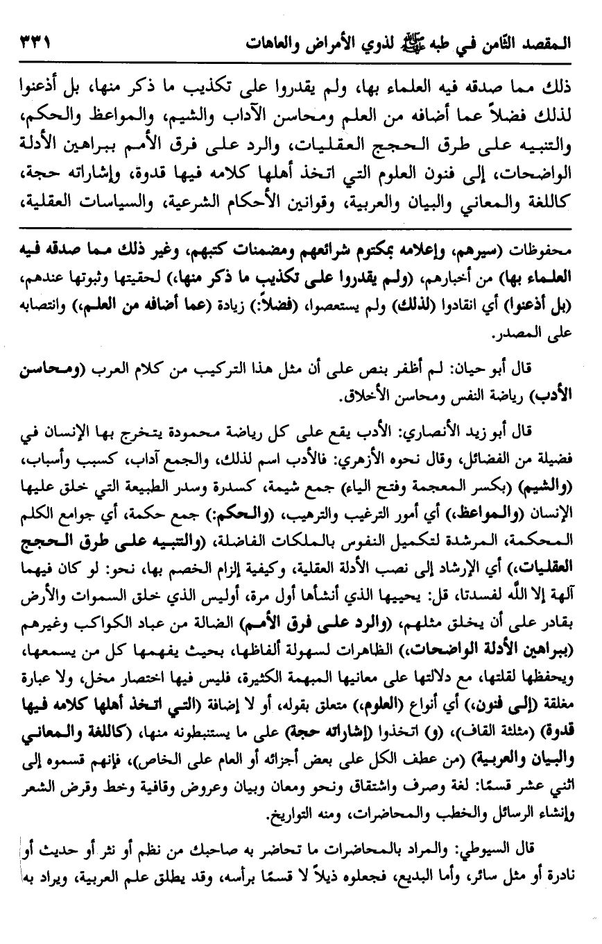 قال أبو زيد الأنصاري: الأدب يقع على كل رياضة محمودة يتخرج بها الإنسان في فضيلة من الفضائل، وقال نحوه الأزهري: فالأدب اسم لذلك، والجمع آداب، كسبب وأسباب، "والشيم" "بكسر المعجمة وفتح الياء" جمع شيمة، كسدرة وسدر الطبيعة التي خلق عليها الإنسان "والمواعظ" أي أمور الترغيب والترهيب، "والحكم" جمع حكمة، أي جوامع الكلم المحكمة، المرشدة لتكميل النفوس بالملكات الفاضلة: "والتنبيه على طرق الحجج العقليات" أي الإرشاد إلى نصب الأدلة العقلية، كيفية إلزام الخصم بها، نحو: لو كان فيهما آلهة إلا الله لفسدتا، قل: يحييها الذي أنشأها أول مرة، أوليس الذي خلق السماوات والأرض بقادر على أن يخلق مثلهم، "والرد على فرق الأمم" الضالة من عباد الكواكب وغيرهم "ببراهين الأدلة الواضحات" الظاهرات لسهولة ألفاظها، بحيث يفهمها كل من يسمعها، ويحفظها لقلتها، مع دلالتها على معانيها المبهمة الكثيرة، فليس فيها اختصار مخل، ولا عبارة مغلقة "إلى فنون" أي أنواع "العلوم" متعلق بقوله، أو لا إضافة "التي اتخذ أهلها كلامه فيها قدوة" "مثلثة القاف"، "و" اتخذوا "إشاراته حجة" على ما يستنبطونه منها، "كاللغة والمعاني والبيان والعربية" "من عطف الكل على بعض أجزائه أو العام على الخاص"، فإنهم قسموه إلى اثني عشرة قسمًا: لغة وصرف واشتقاق ونحو ومعان وبيان وعروض وقافية وخط وقرض الشعر وإنشاء الرسائل والخطب والمحاضرات، ومنه التواريخ.