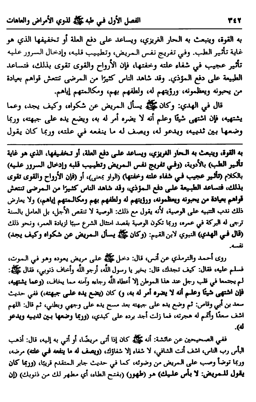 به القوة، وينبعث به الحار الغريزي، ويساعد على دفع العلة أو تخفيفها الذي هو غاية تأثير الطب. وفي تفريج نفس المريض، وتطييب قلبه، وإدخال السرور عليه تأثير عجيب في شفاء علته وخفتها، فإن الأرواح والقوى تقوى بذلك، فتساعد الطبيعة على دفع المؤذي. وقد شاهد الناس كثيرًا من المرضى تنتعش قواهم بعيادة من يحبونه ويعظمونه، ورؤيتهم له، ولطفهم بهم، ومكالمتهم إياهم.