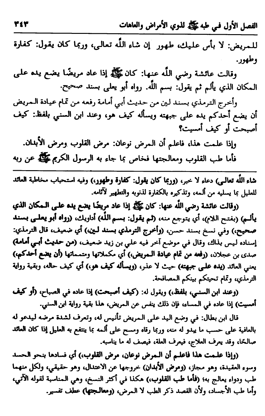 "وعند ابن السني، بلفظ" ويقول له: "كيف أصبحت" إذا عاده في الصباح، "أو كيف أمسيت" إذا عاده في المساء، فإن ذلك ينفس عن المريض، هذا بقية رواية ابن السني.