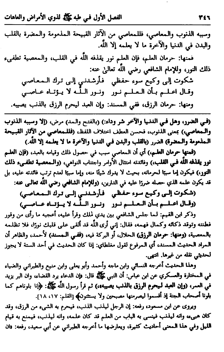 "فمنها حرمان العلم" أي أن المعاصي سبب في حصول ذلك وقيامه بالعبد، "فإن العلم نور يقذفه الله في القلب" وفائدته امتثال الأوامر واجتناب النواهي، "والمعصية تطفئ ذلك النور" فيكون إما سببًا لحرمانه، بحيث لا يدرك شيئًا منه، وإما سببًا لعدم ترتب فائدته عليه، بل قد يكون علمه الذي حصله ضررًا عليه في الدارين، "وللإمام الشافعي رضي الله تعالى عنه: