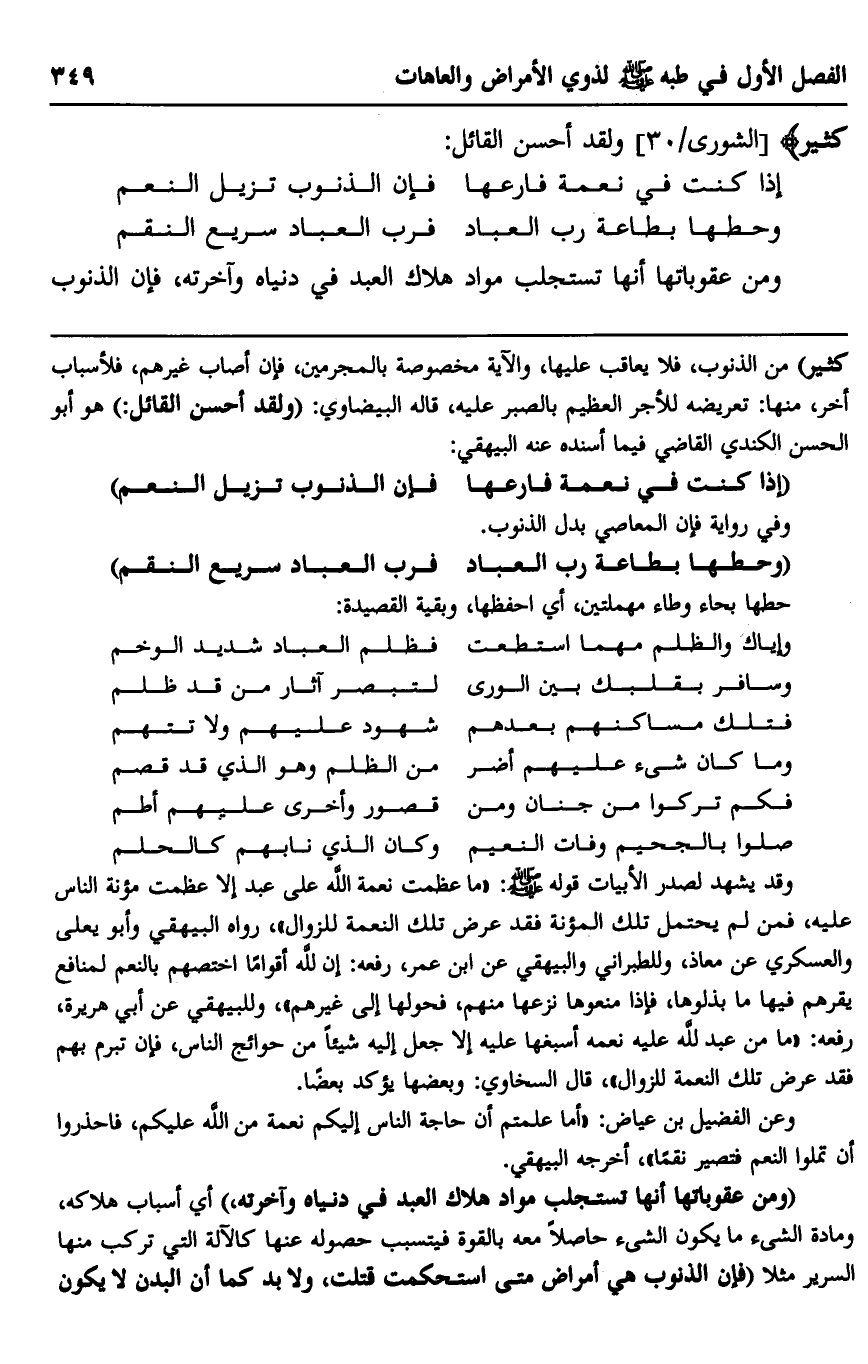 وقد يشهد لصدر الأبيات قوله صلى الله عليه وسلم: "ما عظمت نعمة الله على عبد إلا عظمت مؤنة الناس عليه، فمن لم يحتمل تلك المؤنة فقد عرض تلك النعمة للزوال"، رواه البيهقي وأبو يعلى والعسكري عن معاذ، وللطبراني والبيهقي عن ابن عمر، رفعه: "إن لله أقوامًا اختصهم بالنعم لمنافع يقرهم فيها ما بذلوها، فإذا منعوها نزعها منهم، فحولها إلى غيرهم"، وللبيهقي عن أبي هريرة، رفعه: "ما من عبد لله عليها نعمة أسبغها عليه إلا جعل إليه شيئًا من حوائج الناس، فإن تبرم بهم فقد عرض تلك النعمة للزوال"، قال السخاوي: وبعضها يؤكد بعضًا.
