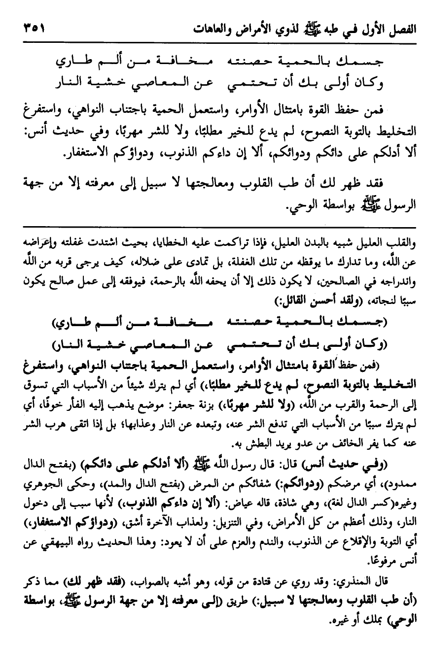 فمن حفظ القول بامتثال الأوامر، واستعمل الحمية باجتناب النواهي، واستفرغ التخليط بالتوبة النصوح، لم يدع للخير مطالبًا، ولا للشر مهربًا، وفي حديث أنس: "ألا أدلكم على دائكم ودوائكم، ألا إن دائكم الذنوب، ودواؤكم الاستغفار".