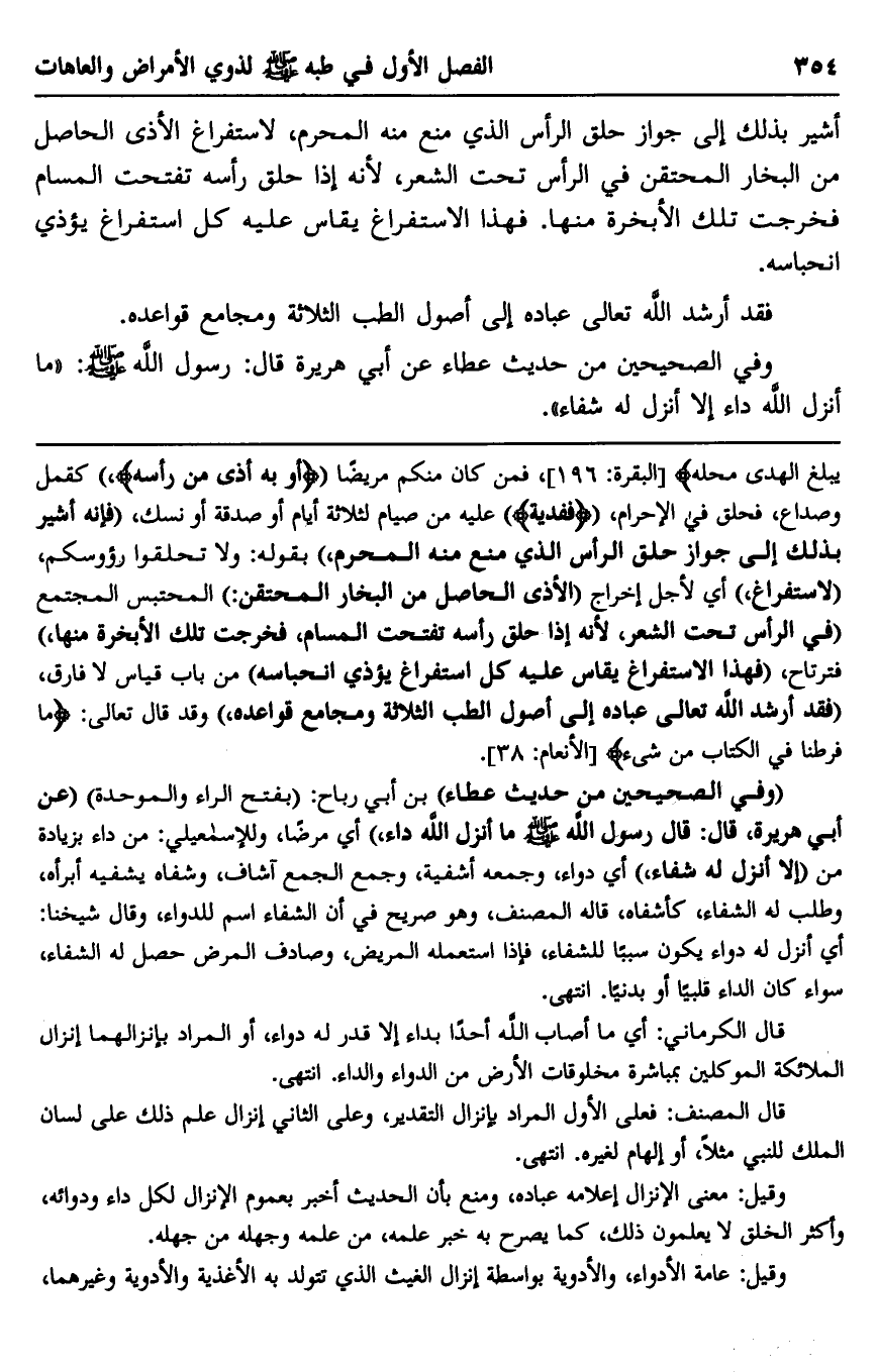 يَبْلُغَ الْهَدْيُ مَحِلَّهُ} [البقرة: 196] ، {فَمَنْ كَانَ مِنْكُمْ مَرِيضًا أَوْ بِهِ أَذًى مِنْ رَأْسِهِ} كقمل وصداع، فحلق في الإحرام، {فَفِدْيَة} عليه من صيام لثلاثة أيام أو صدقة أو نسك، "فإنه أشير بذلك إلى جواز حلق الرأس الذي منه منه المحرم" بقوله: ولا تحلقوا رؤوسكم، "لاستفراغ" أي لأجل إخراج "الأذى الحاصل من البخار المحتقن" المحتبس المجتمع "في الرأس تحت الشعر؛ لأنه إذا حلق رأسه تفتحت المسام، فخرجت تلك الأبخرة منها" فترتاح، "فهذا الاستفراغ يقاس عليه كل استفراغ يؤذي انحباسه" من باب قياس لا فارق، "فقد أرشد الله تعالى عباده إلى أصول الطب الثلاثة ومجامع قواعده" وقد قال تعالى: {مَا فَرَّطْنَا فِي الْكِتَابِ مِنْ شَيْءٍ} [الأنعام: 38] .
