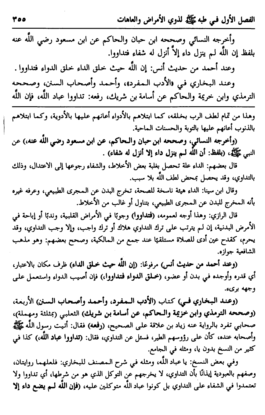 قال الرازي: وهذا أوجه لعمومه، "فتداووا" وجوبًا في الأمراض القلبية، وندبًا أو إباحة في الأمراض البدنية، إن لم يترتب على ترك التداوي هلاك أو ترك واجب، وإلا وجب التداوي، وقد يحرم، كقدح عين أدى للصلاة مستلقيًا عند جمع من المالكية، وصحح بعضهم: وهو مذهب الشافعية جوازه.