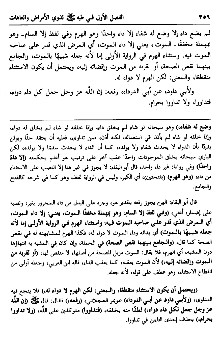 "ويحتمل أن يكون الاستثناء منقطعًا، والمعنى، لكن الهرم لا دواء له" فلا ينجح فيه التداوي، "ولأبي داود عن أبي الدرداء" عويمر العجلاني، "رفعه" فقال: قال صلى الله عليه وسلم: "إن الله عز وجل جعل لكل داء دواء" لطفًا منه بخلقه، "فتداووا" متوكلين على الله، "ولا تداووا بحرام" بحذف إحدى التاءين في تداووا.