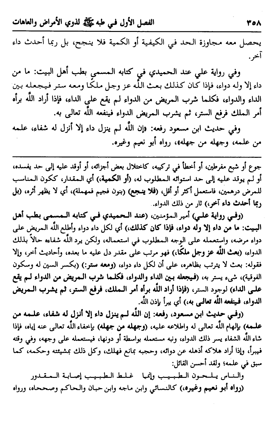 "وفي حديث ابن مسعود، رفعه: "إن الله لم ينزل داء إلا أنزل له شفاء، علمه من علمه" بإلهام الله تعالى له واطلاعه عليه، "وجهله من جهله" بإخفاء الله تعالى عنه إياه، فإذا شاء الله الشفاء يسر ذلك الدواء، ونبه مستعمله بواسطة أو دونها، فيستعمله على وجهه، وفي وقته فيبرأ، وإذا أراد هلاكه أذهله عن دوائه، وحجبه بمانع فهلك، وكل ذلك بمشيئته وحكمه، كما سبق في علمه؛ ولقد أحسن القائل: