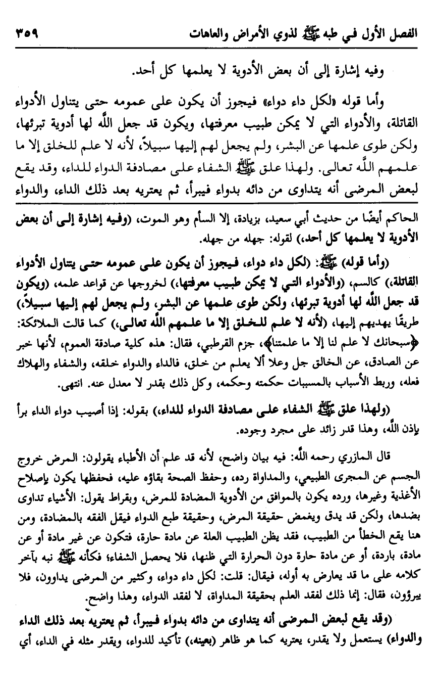 وأما قوله "لكل داء دواء" فيجوز أن يكون على عمومه حتى يتناول الأدواء القاتلة، والأدواء التي لا يمكن طبيب معرفتها، ويكون قد جعل الله لها أدوية تبرئها، ولكن طوى علمها عن البشر، ولم يجعل لهم إليها سبيلًا؛ لأنه لا علم للخلق إلا ما علمهم الله تعالى. ولهذا علق صلى الله عليه وسلم الشفاء على مصادفة الدواء للداء، وقد يقع لبعض المرضى أنه يتداوى من دائه بدواء فيبرأ، ثم يعتريه بعد ذلك الداء، والدواء