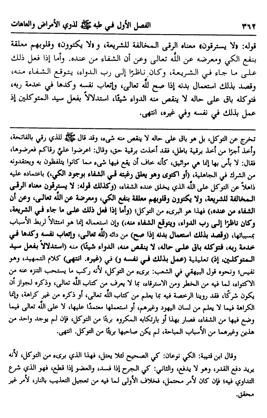 وقال ابن قتيبة: الكي نوعان: كي الصحيح لئلا يعتل، فهذا الذي برئ من التوكل؛ لأنه يريد دفع القدر، وهو لا يدفع، والثاني: كي الجرح إذا فسد، والعضو إذا قطع، فهو الذي شرع التداوي فيه؛ فإن كان لأمر محتمل، فخلاف الأولى لما فيه من تعجيل التعذيب بالنار، لأمر غير محقق.