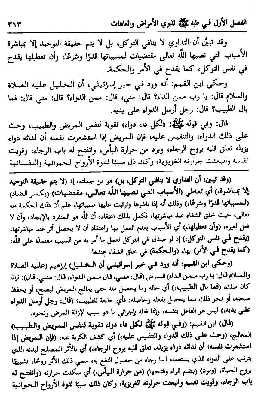 وقد تبين أن التداوي لا ينافي التوكل، بل لا يتم حقيقة التوحيد إلا بمباشرة الأسباب التي نصبها الله تعالى مقتضيات لمسبباتها قدرًا وشرعًا، وأن تعطيلها يقدح في نفس التوكل، كما يقدح في الأمر والحكمة.