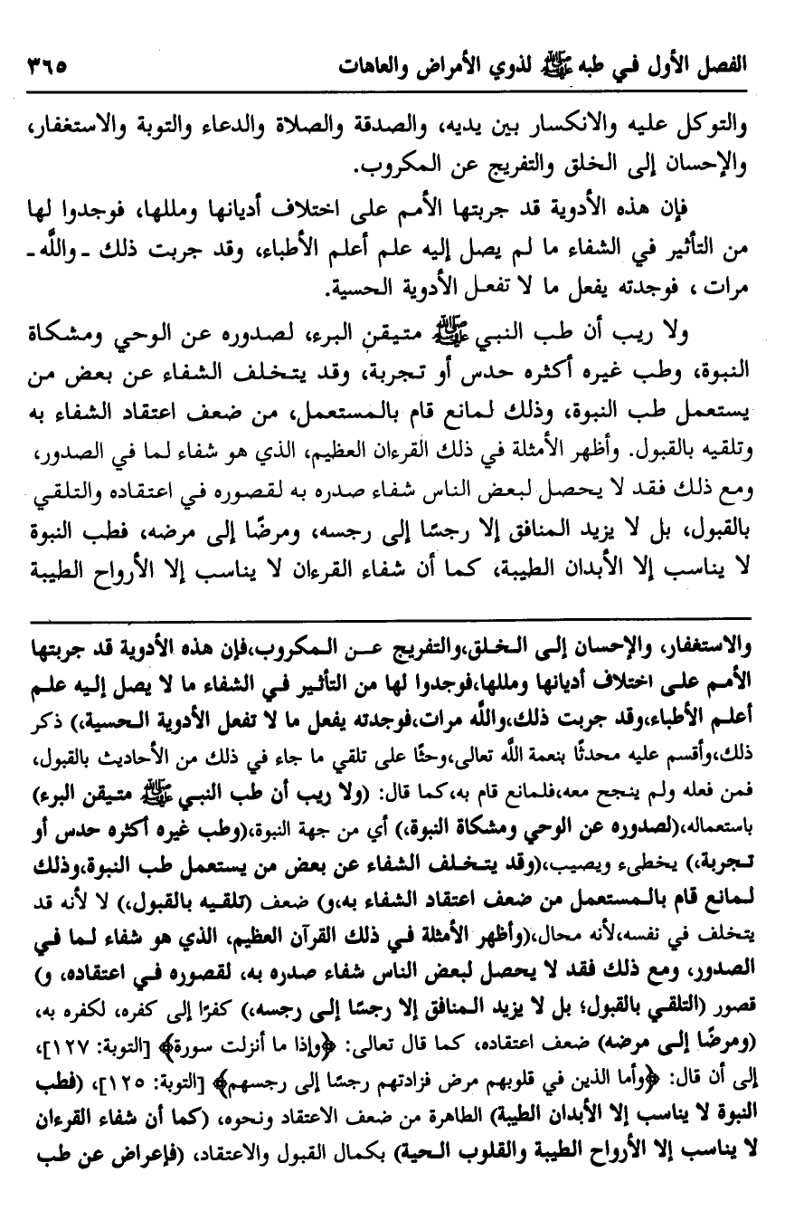 ولا ريب أن طب النبي صلى الله عليه وسلم متيقن البرء، لصدوره عن الوحي ومشكاة النبوة، وطب غيره أكثره حدس أو تجربة، وقد يتخلف الشفاء عن بعض من يستعمل طب النبوة، وذلك لمانع قام بالمستعمل، من ضعف اعتقاد الشفاء به وتلقيه بالقبول. وأظهر الأمثلة في ذلك القرآن العظيم، الذي هو شفاء لما في الصدور، ومع ذلك فقد لا يحصل لبعض الناس شفاء صدره به لقصوره في اعتقاده والتلقي بالقبول، بل لا يزيد المنافق إلا رجسًا إلى رجسه، ومرضًا إلى مرضه، فطب النبوة لا يناسب إلا الأبدان الطيبة، كما أن شفاء القرآن لا يناسب إلا الأرواح الطيبة.