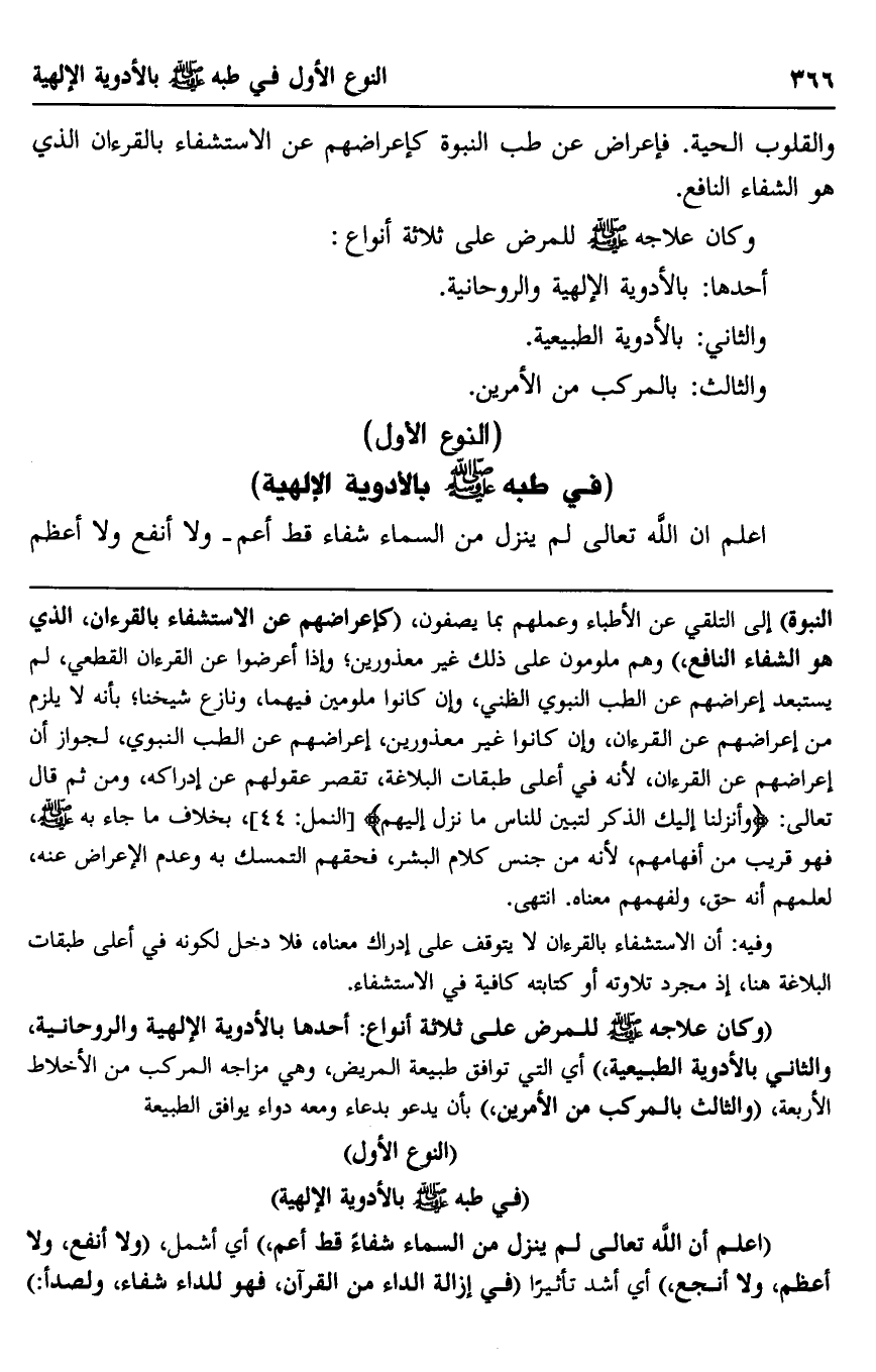 "وكان علاجه صلى الله عليه وسلم للمرض على ثلاثة أنواع: أحدها بالأدوية الإلهية والروحانية، والثاني بالأدوية الطبيعية" أي التي توافق طبيعة المريض، وهي مزاجه المركب من الأخلاط الأربعة، "والثالث بالمركب من الأمرين" بأن يدعو بدعاء ومعه دواء يوافق الطبيعة