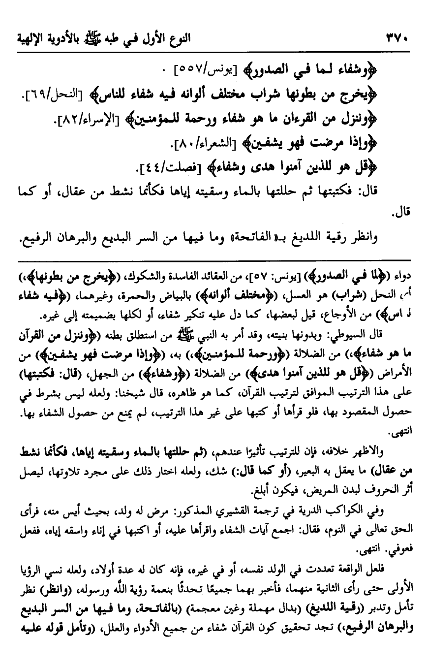 قال السيوطي: وبدونها بنيته وقد أمر به النبي صلى الهل عليه وسلم من استطلق بطنه " {وَنُنَزِّلُ مِنَ الْقُرْآنِ مَا هُوَ شِفَاءٌ} " من الضلالة " {وَرَحْمَةٌ لِلْمُؤْمِنِينَ} " به، " {وَإِذَا مَرِضْتُ فَهُوَ يَشْفِينِ} " من الأمراض " {قُلْ هُوَ لِلَّذِينَ آمَنُوا هُدًى} " من الضلالة " {وَشِفَاءٌ} " من الجهل، "قال: فكتبتها" على هذا الترتيب الموافق لترتيب القرآن، كما هو ظاهره، قال شيخنا: ولعله ليس بشرط من حصول المقصود بها، فلو قرأها أو كتبها على غير هذا الترتيب، لم يمنع من حصول الشفاء بها، انتهى.