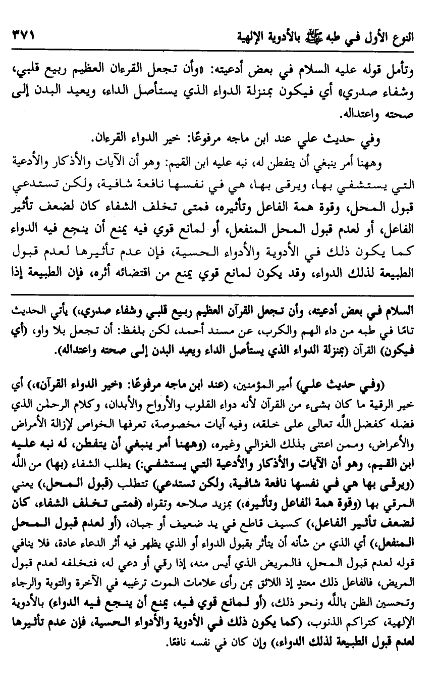 وتأمل قوله عليه السلام في بعض أدعيته: "وأن تجعل القرآن العظيم ربيع قلبي، وشفاء صدري" أي فيكون بمنزلة الدواء الذي يستأصل الداء، ويعيد البدن إلى صحته واعتداله.