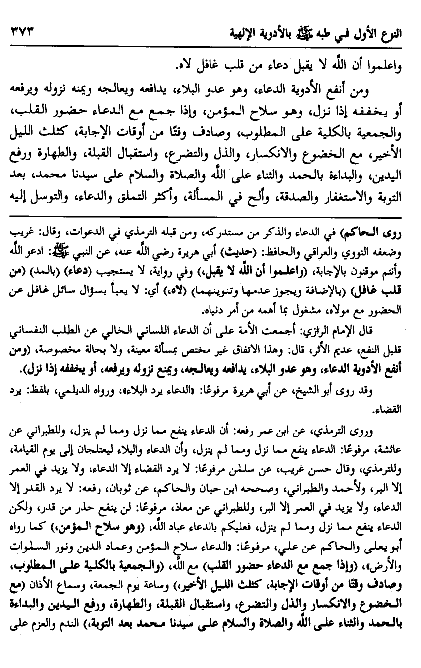 ومن أنفع الأدوية الدعاء، وهو عدو البلاء، يدافعه ويعالجه ويمنه نزوله ويرفعه أو يخففه إذا نزل، وهو سلاح المؤمن، وإذا جمع مع الدعاء حضور القلب، والجمعية بالكلية على المطلوب، وصادف وقتًا من أوقات الإجابة، كثلث الليل الأخير، مع الخضوع والانكسار، والذل والتضرع، واستقبال القبلة، والطهارة ورفع اليدين، والبداءة بالحمد والثناء على الله والصلاة والسلام على سيدنا محمد، بعد التوبة والاستغفار والصدقة، وألح في المسألة، وأكثر التعلق والدعاء، والتوسل إليه