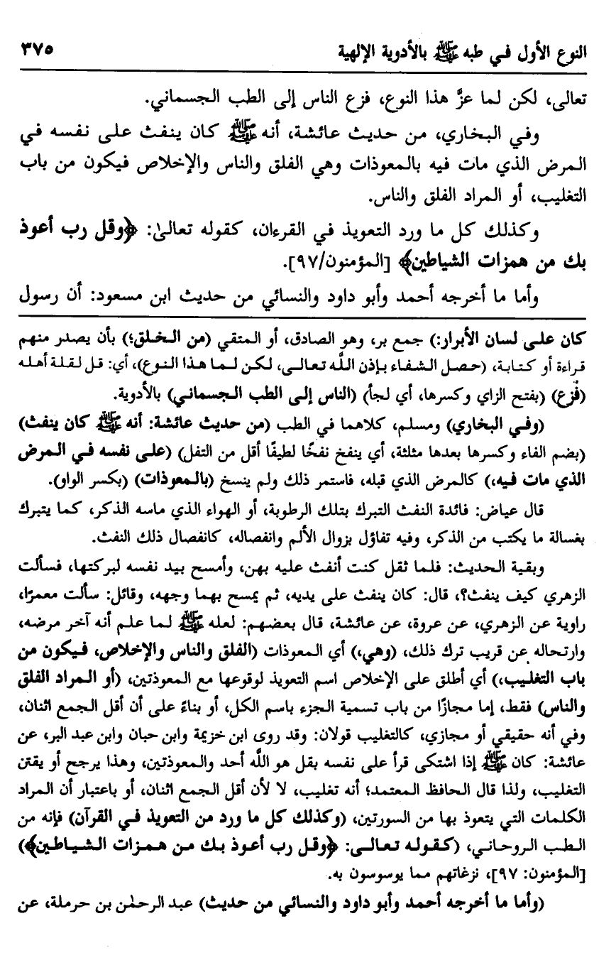 وفي البخاري، من حديث عائشة، أنه صلى الله عليه وسلم كان ينفث على نفسه في المرض الذي مات فيه بالمعوذات وهي الفلق والناس والإخلاص فيكون من باب التغليب، أو المراد الفلق والناس.