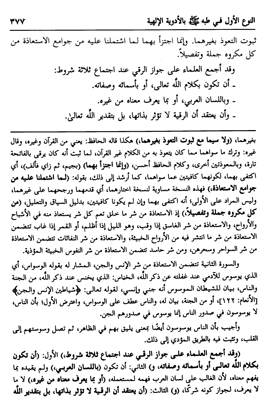 "وقد أجمع العلماء على جواز الرقي عند اجتماع ثلاثة شروط" الأول: "أن تكون بكلام الله تعالى أو بأسمائه وصفاته، و" الثاني: أن تكون "باللسان العربي" ولم يقيده بما يفهم معناه؛ لأن الغالب على لسان العرب فهمه لمستعمله، "أو بما يعرف معناه من غيره" لا من لا يعرف، لجواز كونه شركًا، "و" الثالث: "أن يعتقد أن الرقية لا تؤثر بذاتها، بل بتقدير الله