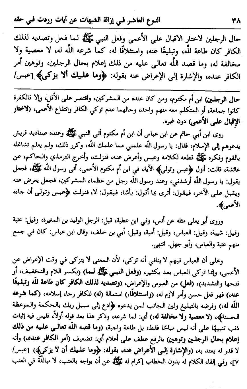روى ابن أبي حاتم عن ابن عباس أن أبن أم مكتوم أتى النبي صلى الله عليه وسلم وعنده صناديد قريش يدعوهم إلى الإسلام، فقال: يا رسول الله علمني مما علمك الله، وكرر ذلك، ولم يعلم تشاغله بالقوم فكره صلى الله عليه وسلم قطعه لكلامه وعبس وأعرض عنه، فنزلت، وأخرج الترمذي والحاكم، عن عائشة قالت: أنزل {عَبَسَ وَتَوَلَّى} الآية، في ابن أم مكتوم الأعمى، أتى رسول الله صلى الله عليه وسلم فجعل يقول: يا رسول الله أرشدني، وعند رسول الله رجل من عظماء المشركين، فجعل يعرض عنه ويقبل على الآخر، فيقول: أترى بما أقول: بأسًا، فيقول: لا، فنزلت {عَبَسَ وَتَوَلَّى أَنْ جَاءَهُ الْأَعْمَى} .