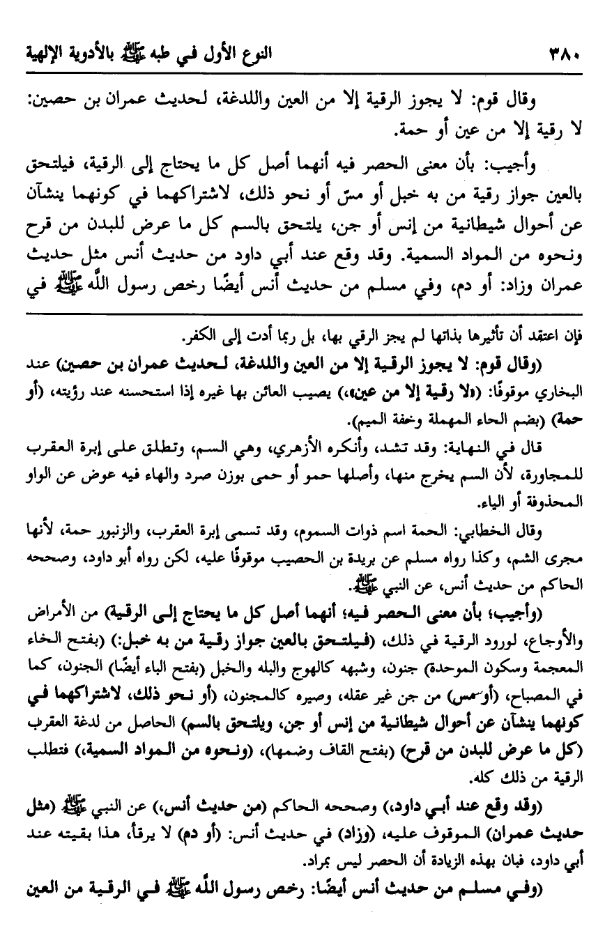 وأجيب: بأن معنى الحصر فيه أنهما أصل كل ما يحتاج إلى الرقية، فيلتحق بالعين جواز رقية من به خبل أو مس أو نحو ذلك؛ لاشتراكهما في كونهما ينشأان عن أحوال شيطانية من إنس أو جن، يلتحق بالسم كل ما عرض للبدن من قرح ونحوه من المواد السمية. وقد وقع عند أبي داود من حديث أنس مثل حديث عمران وزاد: أو دم، وفي مسلم من حديث أنس أيضًا رخص رسول الله صلى الله عليه وسلم في