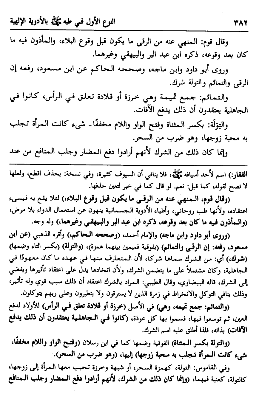 وروى أبو داود وابن ماجه، وصححه الحاكم عن ابن مسعود: "رفعه إن الرقى والتمائم والتولة شرك".