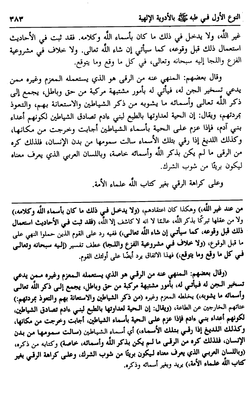 وقال بعضهم: المنهي عنه من الرقى هو الذي يستعمله المعزم وغيره ممن يدعي تسخير الجن له، فيأتي له بأمور مشتبهة مركبة من حق وباطل، يجمع إلى ذكر الله تعالى وأسمائه ما يشوبه من ذكر الشياطين والاستعانة بهم، والتعوذ بمردتهم، ويقال: إن الحية لعداوتها بالطبع لبني آدم تصادق الشياطين لكونهم أعداء بني آدم، فإذا عزم على الحية بأسماء الشياطين أجابت وخرجت من مكانها، وكذلك اللديغ إذا رقي بتلك الأسماء سالت سمومها من بدن الإنسان، فلذلك كره من الرقى ما لم يكن بذكر الله وأسمائه خاصة، وباللسان العربي الذي يعرف معناه ليكون بريئًا من شوب الشرك.