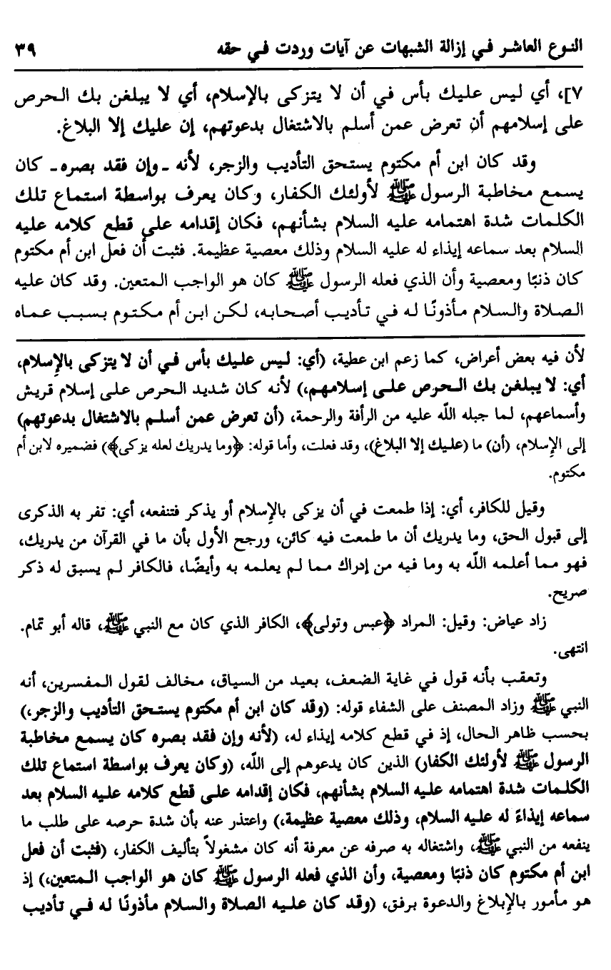 وتعقب بأنه قول في غاية الضعف، بعيد من السياق، مخالف لقول المفسرين، أنه النبي صلى الله عليه سلم وزاد المصنف على الشفاء قوله: "وقد كان ابن أم مكتوم يستحق التأديب والزجر" بحسب ظاهر الحال، إذ في قطع كلامه إيذاء له، "لأنه وإن فقد بصره كان يسمع مخاطبة الرسول صلى الله عليه وسلم شدة اهتمامه عليه السلام بشأنهم، فكان إقدامه على قطع كلامه عليه السلام بعد سماعه إيذاءً له عليه السلام، وذلك معصية عظيمة" واعتذر عنه بأنه شدة حرصه على طلب ما ينفعه من النبي صلى الله عليه وسلم واشتغاله به صرفه عن معرفة أنه كان مشغولًا بتأليف الكفار، "فثبت أن فعل ابن أم مكتوم كان ذنبًا ومعصية، وأن الذي فعله الرسول صلى الله عليه وسلم كان هو الواجب المتعين" إذ هو مأمور بالإبلاغ والدعوة برفق، "وقد كان عليه الصلاة والسلام مأذونًا له في تأديب