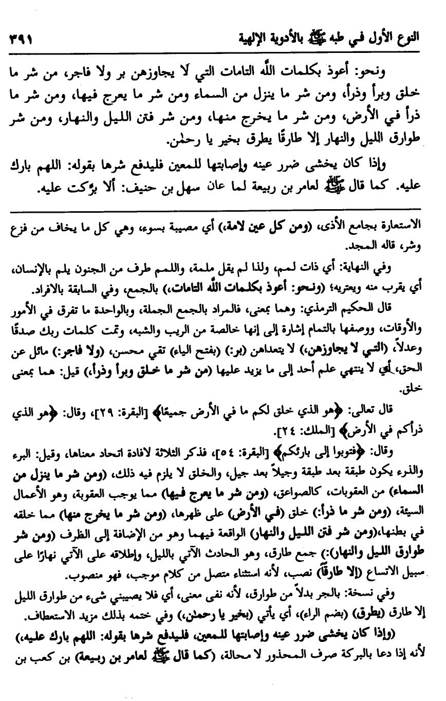 ونحو: أعوذ بكلمات الله التامات التي لا يجاوزهن بر ولا فاجر، من شر ما خلق وبرأ وذرأ، ومن شر ما ينزل من السماء ومن شر ما يعرج فيها، ومن شر ما ذرأ في الأرض، ومن شر ما يخرج منها، ومن شر فتن الليل والنهار، ومن شر طوارق الليل والنهار إلا طارقًا يطرق بخير يا رحمن.
