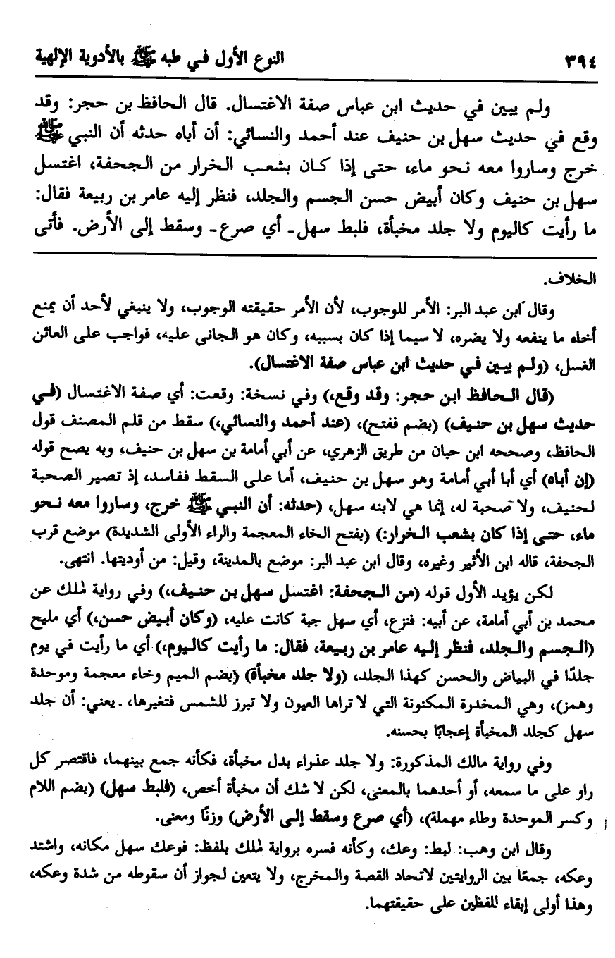 ولم يبين في حديث ابن عباس صفة الاغتسال. قال الحافظ ابن حجر: وقد وقع في حديث سهل بن حنيف عند أحمد والنسائي: أن أباه حدثه أن النبي صلى الله عليه وسلم خرج وساروا معه نحو ماء، حتى إذا كان بشعب الخرار من الجحفة، اغتسل سهل بن حنيف وكان أبيض حسن الجسم والجلد، فنظر إليه عامر بن ربيعة قال: ما رأيت كاليوم ولا جلد مخبأة، فلبط سهل -أي صرع- وسقط إلى الأرض. فأتى