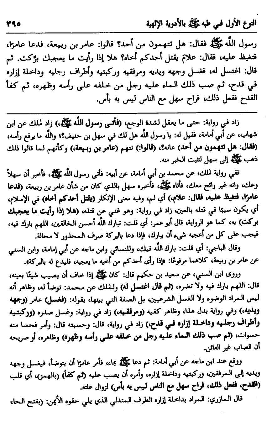 رسول الله صلى الله عليه وسلم فقال: "هل تتهمون من أحد"؟ قالوا: عامر بن ربيعة، فدعا عامرًا، فتغيظ عليه، فقال: "علام يقتل أحدكم أخاه؟ هلا إذا رأيت ما يعجبك بركت". ثم قال: "اغتسل له"، فغسل وجهه ويديه ومرفقيه وركبتيه وأطراف رجليه وداخلة إزاره في قدح، ثم صب ذلك الماء عليه رجل من خلفه على رأسه وظهره، ثم كفأ القدح ففعل ذلك، فراح سهل مع الناس ليس به بأس.