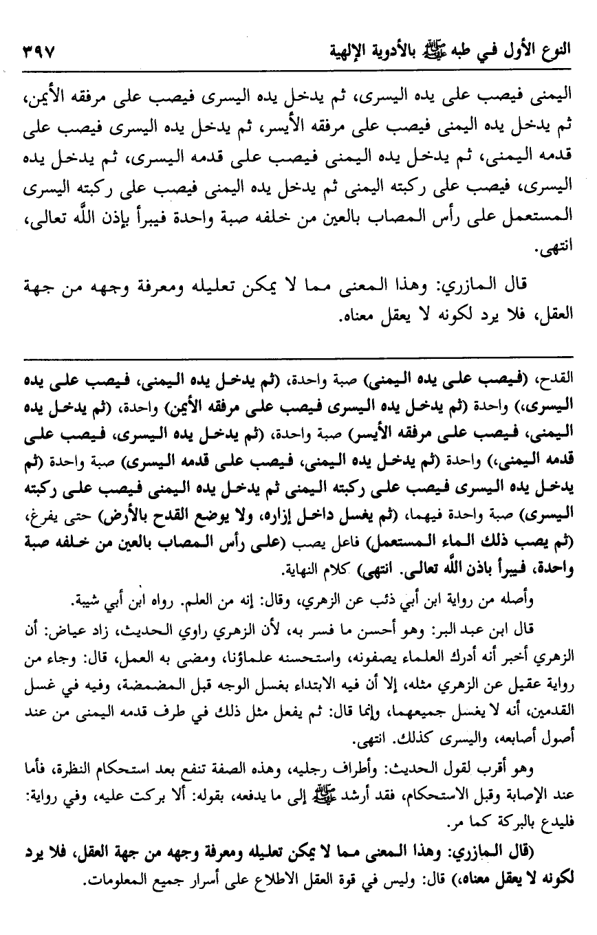 "قال المازري: وهذا المعنى مما لا يمكن تعليله ومعرفة وجهه من جهة العقل، فلا يرد لكونه لا يعقل معناه" قال: وليس في قوة العقل الاطلاع على أسرار جميع المعلومات.