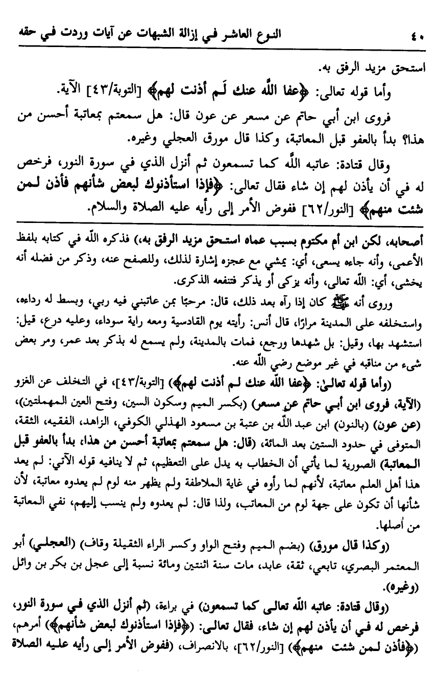 وقال قتادة: عاتبه الله كما تسمعون ثم أنزل الذي في سورة النور، فرخص له في أن يأذن لهم إنشاء فقال تعالى: {فَإِذَا اسْتَأْذَنُوكَ لِبَعْضِ شَأْنِهِمْ فَأْذَنْ لِمَنْ شِئْتَ مِنْهُمْ} [النور: 62] ، ففوض الأمر إلى رأيه عليه الصلاة والسلام.
