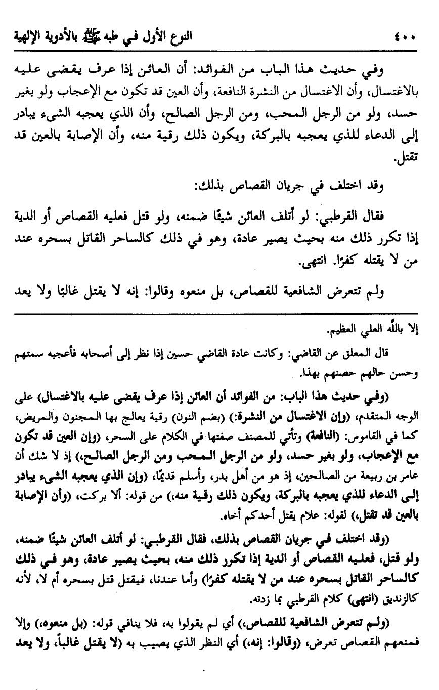 "وقد اختلف في جريان القصاص بذلك، فقال القرطبي: ولو أتلف العائن شيئًا ضمنه، ولو قتل، فعليه القصاص أو الدية إذا تكرر ذلك منه، بحيث يصير عادة، وهو في ذلك كالساحر القاتل بسحره عند من لا يقتله كفرًا" وأما عندنا، فيقتل قتل بسحره أم لا؛ لأنه كالزنديق "انتهى" كلام القرطبي بما زدته.