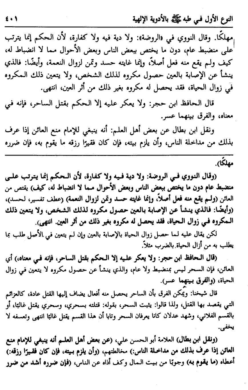 مهلكا. وقال النووي في "الروضة": ولا دية فيه ولا كفارة؛ لأن الحكم إنما يترتب على منضبط عام، دون ما يختص ببعض الناس وبعض الأحوال مما لا انضباط له، كيف ولم يقع منه فعل أصلًا، وإنما غايته حسد وتمن لزوال النعمة، وأيضًا: فالذي ينشأ عن الإصابة بالعين حصول مكروه لذلك الشخص، ولا يتعين ذلك المكروه في زوال الحياة، فقد يحصل له مكروه بغير ذلك من أثر العين، انتهى.