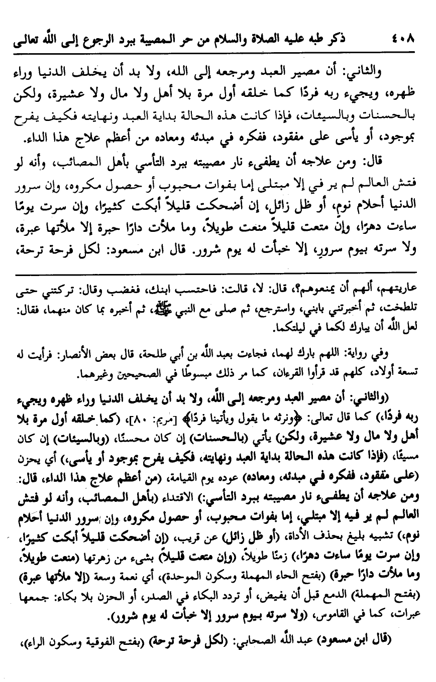 "والثاني: أن مصير العبد ومرجعه إلى الله، ولا بد أن يخلف الدنيا وراء ظهره ويجيء ربه فردًا" كما قال تعالى: {وَنَرِثُهُ مَا يَقُولُ وَيَأْتِينَا فَرْدًا} [مريم: 80] ، "كما خلقه أول مرة بلا أهل ولا مال ولا عشيرة، ولكن" يأتي "بالحسنات" إن كان محسنًا، "وبالسيئات" إن كان مسيئًا، "فإذا كانت هذه الحالة بداية العبد ونهايته، فكيف يفرح بموجود أو يأسى" أي يحزن "على مفقود، ففكره في مبدئه، ومعاده" عوده يوم القيامة، "من أعظم علاج هذا الداء، قال: ومن علاجه أن يطفئ نار مصيبته ببرد التأسي" الاقتداء "بأهل المصائب، وأنه لو فتش العالم لم ير فيه إلا مبتلى، إما بفوات محبوب، أو حصول مكروه، وإن سرور الدنيا أحلام نوم" تشبيه بليغ بحذف الأداة، "أو ظل زائل" عن قريب، "إن أضحكت قليلًا أبكت كثيرًا، وإن سرت يومًا ساءت دهرًا" زمنًا طويلًا، "وإن متعت قليلًا" بشيء من زهرتها "منعت طويلًا، وما ملأت دارًا حبرة" "بفتح الحاء المهملة وسكون الموحدة" أي نعمة وسعة "إلا ملأتها عبرة" "بفتح المهملة" الدمع قبل أن يفيض، أو تردد البكاء في الصدر، أو الحزن بلا بكاء: جمعها عبرات، كما في القاموس، "ولا سرته بيوم سرور إلا خبأت له يوم شرور".