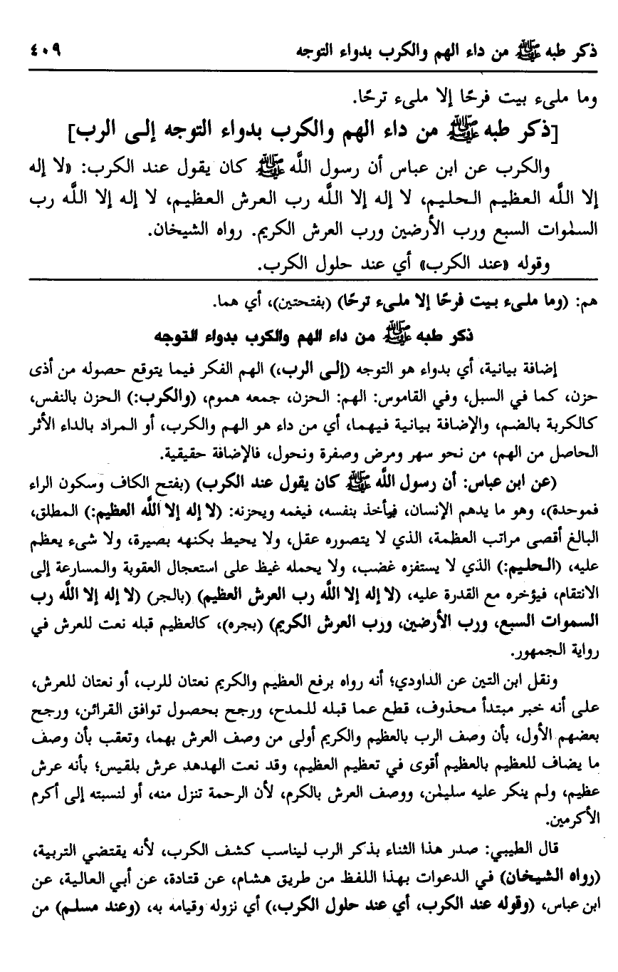 "عن ابن عباس: أن رسول الله صلى الله عليه وسلم كان يقول عند الكرب" "بفتح الكاف وسكون الراء فموحدة" وهو ما يدهم الإنسان، فيأخذ بنفسه، فيغمه ويحزنه: "لا إله إلا الله العظيم" المطلق، البالغ أقصى مراتب العظمة، الذي لا يتصوره عقل، ولا يحيط بكنهه بصيرة، ولا شيء يعظم عليه، "الحليم" الذي لا يستفزه غضب، ولا يحمله غيظ على استعجال العقوبة والمسارعة إلى الانتقام، فيؤخره مع القدرة عليه، "لا إله إلا الله رب العرش العظيم" "بالجر" "لا إله إلا الله رب السماوات السبع، ورب الأرضين، ورب العرش الكريم" "بجره"، كالعظيم قبله نعت للعرش في رواية الجمهور.