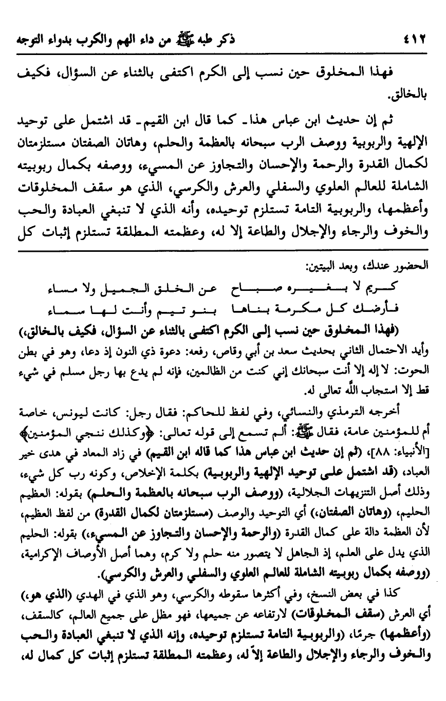أخرجه الترمذي والنسائي، وفي لفظ للحاكم: فقال رجل: كانت ليونس، خاصة أم للمؤمنين عامة، فقال صلى الله عليه وسلم: "ألم تسمع إلى قوله تعالى: {وَكَذَلِكَ نُنْجِي الْمُؤْمِنِين} " [الأنبياء: 88] ، "ثم إن حديث ابن عباس هذا كما قاله ابن القيم" ف زاد المعاد في هدى خير العباد، "قد اشتمل على توحيد الإلهية والربوبية" بكلمة الإخلاص، وكونه رب كل شيء، وذلك أصل التنزيهات الجلالية، "ووصف الرب سبحانه بالعظمة والحلم" بقوله: العظيم الحليم، "وهاتان الصفتان" أي التوحيد والوصف "مستلزمتان لكمال القدرة" من لفظ العظيم؛ لأن العظمة دالة على كمال القدرة "والرحمة والإحسان والتجاوز عن المسيء" بقوله: الحليم الذي يدل على العلم؛ إذ الجاهل لا يتصور منه حلم ولا كرم، وهما أصل الأوصاف الإكرامية، "ووصفه بكمال ربوبيته الشاملة للعالم العلوي والسفلي والعرش والكرسي".