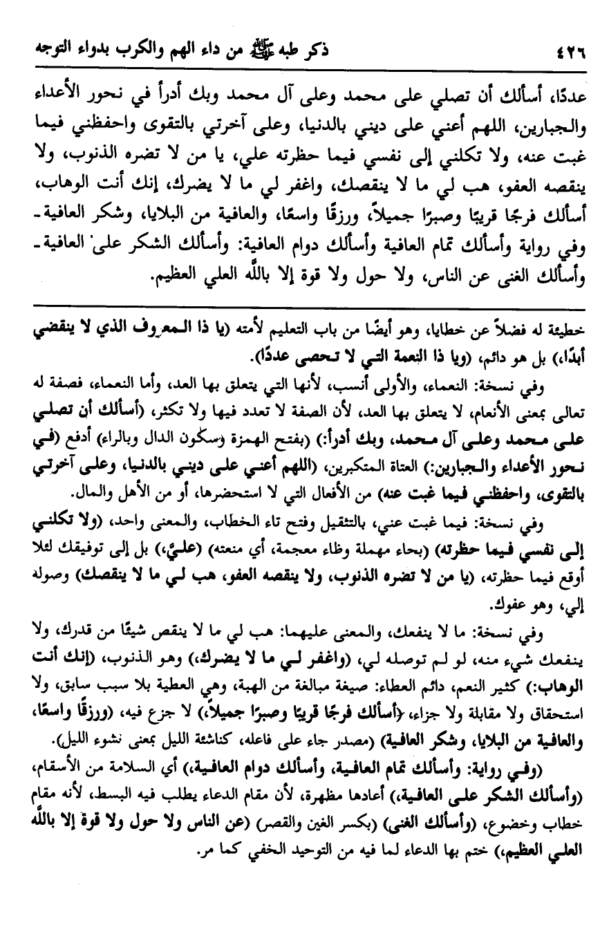 عددًا، أسألك أن تصلي على محمد وعلى آل محمد وبك أدرأ في نحور الأعداء والجبارين، اللهم أعني على ديني بالدنيا، وعلى آخرتي بالتقوى واحفظني فيما غبت عنه، ولا تكلني إلى نفسي فيما حظرته علي، يا من لا تضره الذنوب، ولا ينقصه العفو، هب لي ما لا ينقصك، واغفر لي ما لا يضرك، إنك أنت الوهاب، أسألك فرجًا قريبًا وصبرًا جميلًا، ورزقًا واسعًا، والعافية من البلايا، وشكر العافية -وفي رواية وأسألك تمام العافية وأسألك دوام العافية: وأسألك الشكر على العافية - وأسألك الغنى عن الناس، ولا حول ولا قوة إلا بالله العلي العظيم".