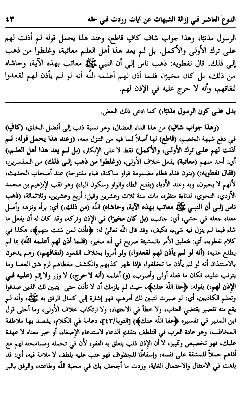الرسول مذنبًا، وهذا جواب شاف كافٍ قاطع، وعند هذا يحمل قوله لم أذنت لهمعلى ترك الاولى والأكمل، بل لم يعد هذا أهل العلم معاتبة، وغلطوا من ذهب إلى ذلك قال نفطويه: ذهب ناس إلى أن النبي صلى الله عليه وسلم معاتب بهذه الآية، وحاشاه من ذلك، بل كان مخيرًا، فلما أذن لهم اعلمه الله أنه لو لم يأذن لهم لقعدوا لنفاقهم، وأنه لا حرج عليه في الإذن لهم.