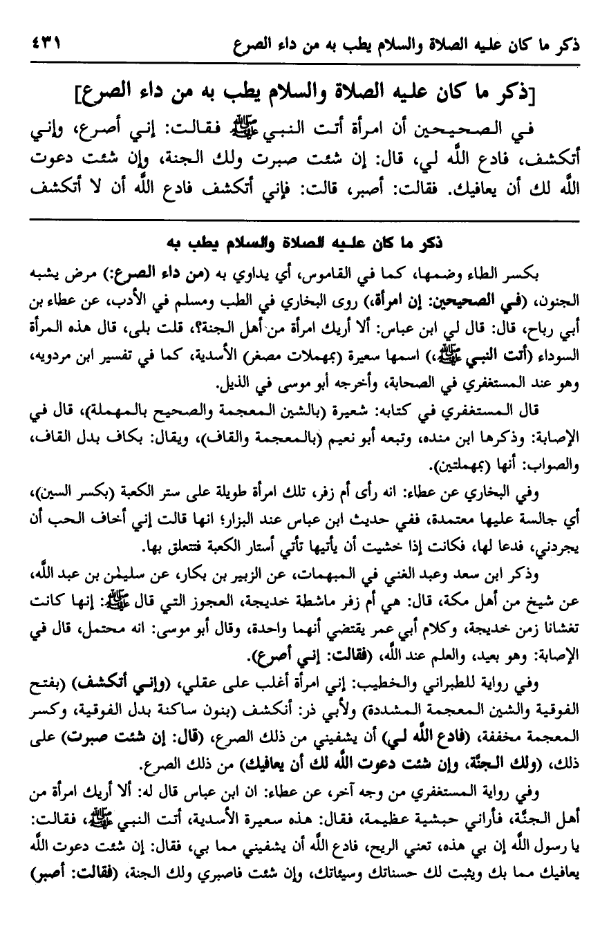 في الصحيحين أن امرأة أتت النبي صلى الله عليه وسلم فقالت: إني أصرع، وإني أتكشف، فادع الله لي، قال: "إن شئت صبرت ولك الجنة، وإن شئت دعوت الله لك أن يعافيك". فقالت: أصبر، قالت: فإني أتكشف فادع الله أن لا أتكشف