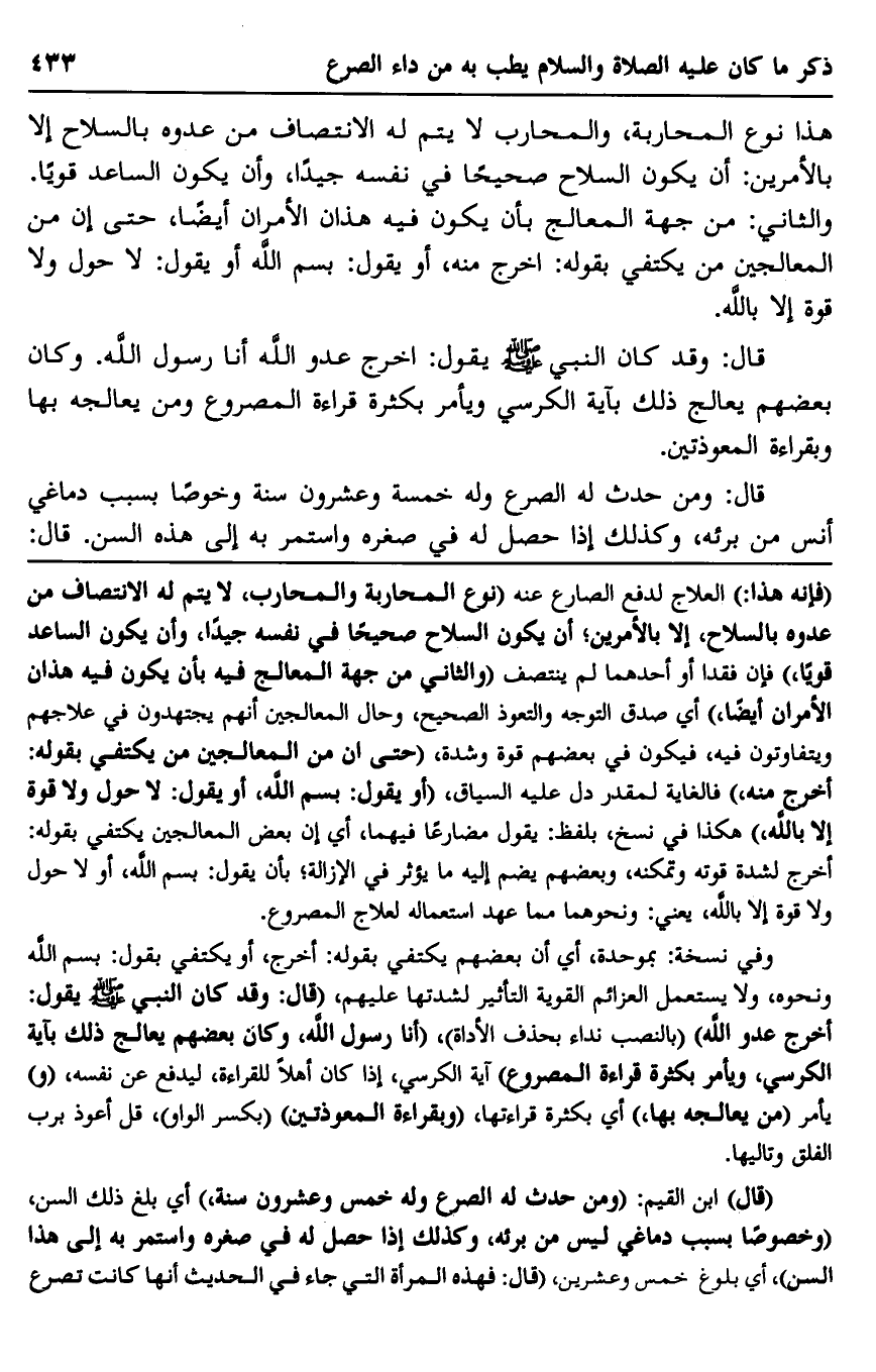قال: وقد كان النبي صلى الله عليه وسلم يقول: "اخرج عدو الله أنا رسول الله". وكان بعضهم يعالج ذلك بآية الكرسي ويأمر بكثرة قراءة المصروع ومن يعالجه بها وبقراءة المعوذتين.