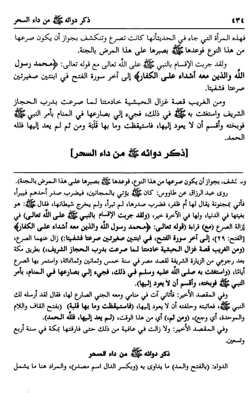 روى عبد الرزاق عن طاوس: كان صلى الله عليه وسلم يؤتى بالمجانين، فيضرب صدر أحدهم فيبرأ، فأتي بمجنونة يقال لها أم ظفر، فضرب صدرها، لم تبرأ، ولم يخرج شيطانها، فقال صلى الله عليه وسلم: "هو بغيتها في الدنيا، ولها في الآخرة خير"، "ولقد جربت الإقسام بالنبي صلى الله عليه وسلم على الله تعالى" في إزالة الصرع "مع" قراءة "قوله تعالى: {مُحَمَّدٌ رَسُولُ اللَّهِ وَالَّذِينَ مَعَهُ أَشِدَّاءُ عَلَى الْكُفَّارِ} [الفتح: 29] ، إلى آخر سورة الفتح، في ابنتين صغيرتين صرعتا فشفيتا" زال عنهما الصرع، "ومن الغريب قصة غزال الحبشية خادمتنا لما صرعت بدرب الحجاز الشريف" بطريق مكة بعد رجوعي من الزيارة الشريفة لقصد مصر في سنة خمس وثمانين وثمانمائة، واستمر بها الصرع أيامًا، "واستغثت به صلى الله عليه وسلم في ذلك، فجيء إلي بصارعها في المنام، بأمر النبي صلى الله عليه وسلم فوبخته، وأقسم أن لا يعود إليها".