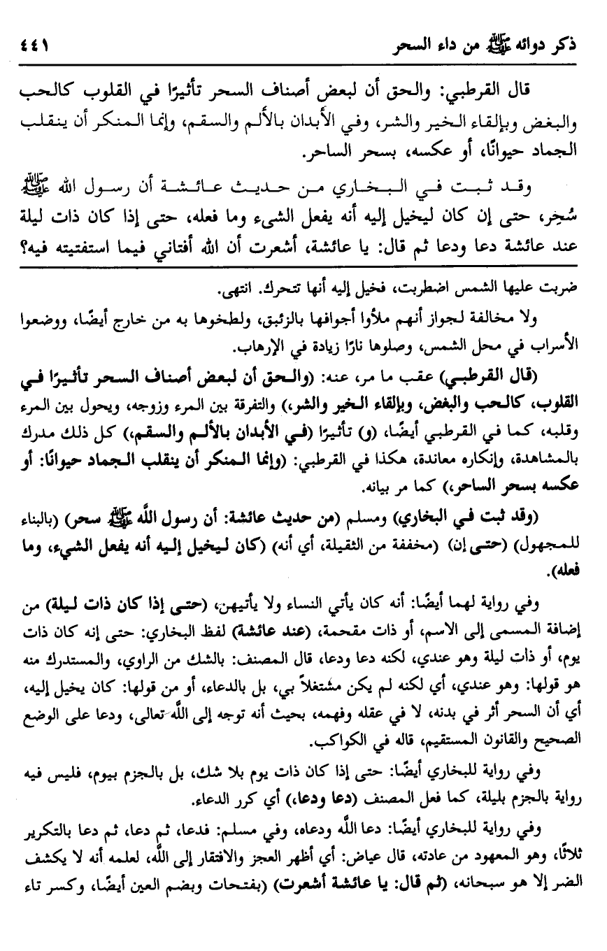 "قال القرطبي" عقب ما مر، عنه: "والحق أن لبعض أصناف السحر تأثيرًا في القلوب، كالحب والبغض، وبإلقاء الخير والشر" والتفرقة بين المرء وزوجه، ويحول بين المرء وقلبه، كما في القرطبي أيضًا، "و" تأثيرًا "في الأبدان بالألم والسقم" كل ذلك مدرك بالمشاهدة، وإنكاره معاندة، هكذا في القرطبي: "وإنما المنكر أن ينقلب الجماد حيوانًا: أو عكسه بسحر الساحر" كما مر بيانه.
