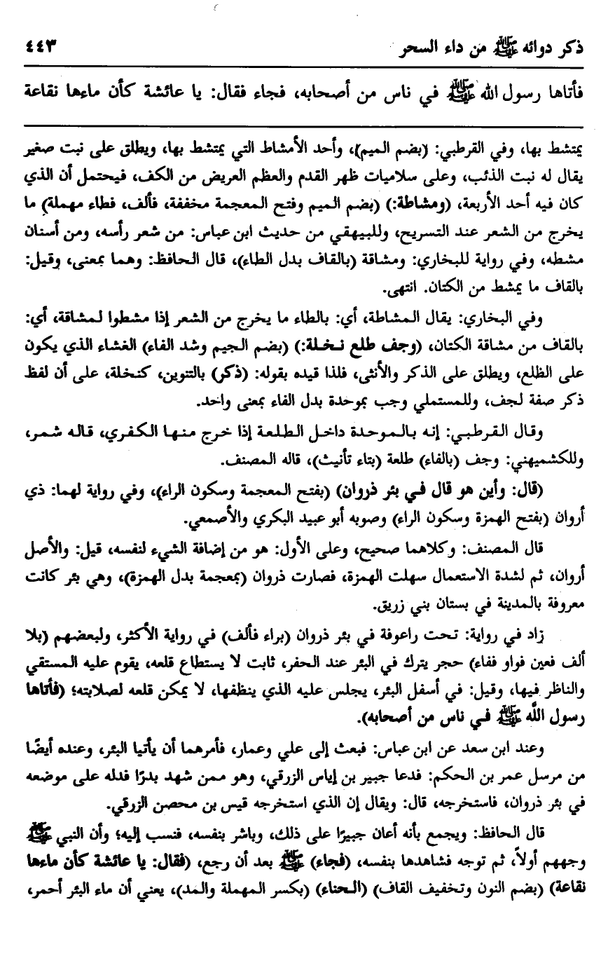 زاد في رواية: تحت راعوفة في بئر ذروان "براء فألف" في رواية الأكثر، ولبعضهم "بلا ألف فعين فواو ففاء" حجر يترك في البئر عند الحفر، ثابت لا يستطاع قلعه، يقوم عليه المستقي والناظر فيها، وقيل: في أسفل البئر، يجلس عليه الذي ينظفها، لا يمكن قلعه لصلابته؛ "فأتاها رسول الله صلى الله عليه وسلم في ناس من أصحابه".