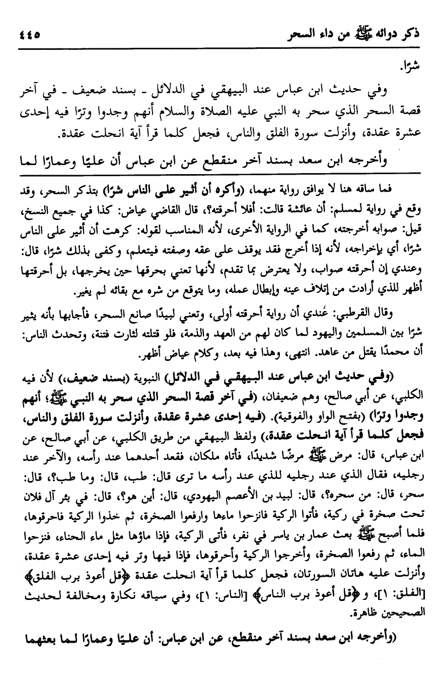 وفي حديث ابن عباس عند البيهقي في الدلائل -بسند ضعيف- في آخر قصة السحر الذي سحر به النبي صلى الله عليه وسلم أنهم وجدوا وترًا فيه إحدى عشرة عقدة، وأنزلت سورة الفلق والناس، فجعل كلما قرأ آية انحلت عقدة.