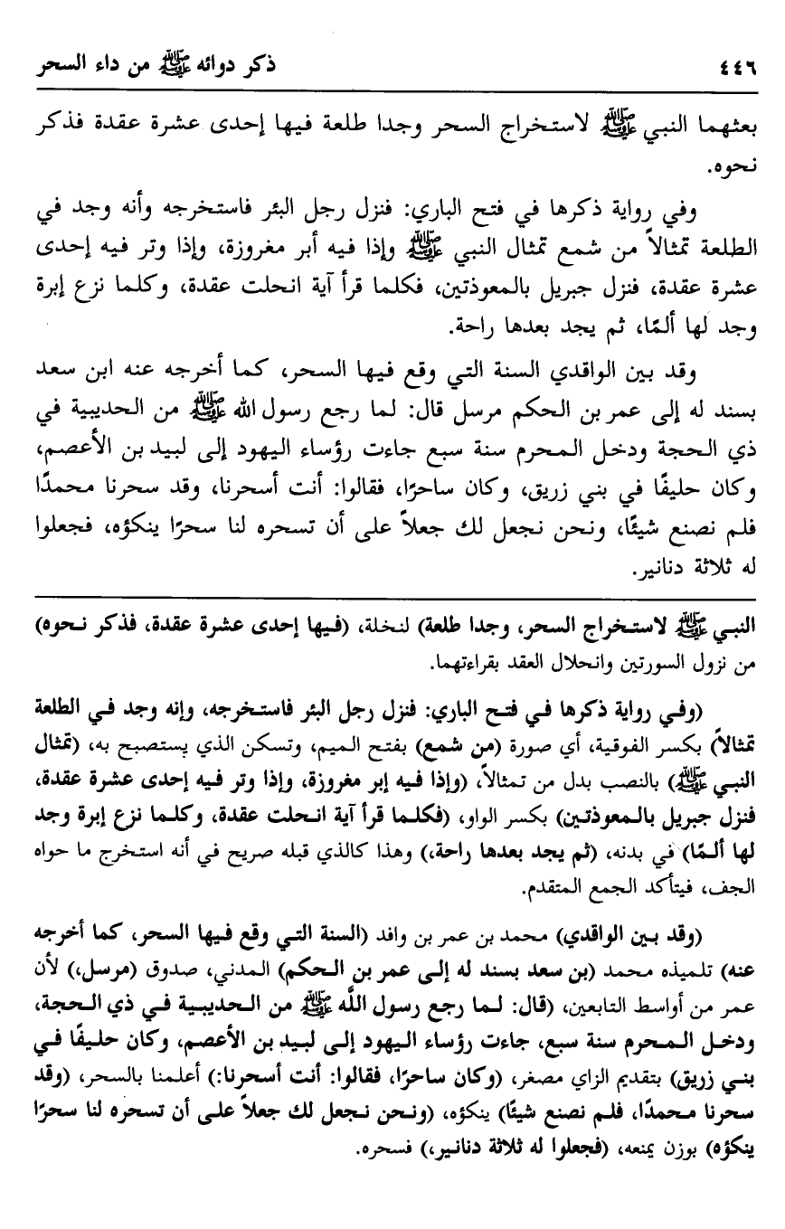 "وقد بين الواقدي" محمد بن عمر بن وافد "السنة التي وقع فيها السحر، كما أخرجه عنه" تلميذه محمد "بن سعد بسند له إلى عمر بن الحكم" المدني، صدوق "مرسل" لأن عمر من أواسط التابعين، "قال: لما رجع رسول الله صلى الله عليه وسلم من الحديبية في ذي الحجة، ودخل المحرم سنة سبع، جاءت رؤساء اليهود إلى لبيد بن الأعصم، وكان حليفًا في بني زريق" بتقديم الزاي مصغر، "وكان ساحرًا، فقالوا: أنت أسحرنا" أعلمنا بالسحر، "وقد سحرنا محمدًا، فلم نصنع شيئًا" ينكؤه، "ونحن نجعل لك جعلًا على أن تسحره لنا سحرًا ينكؤه" بوزن يمنعه، "فجعلوا له ثلاثًا دنانير" فسحره.