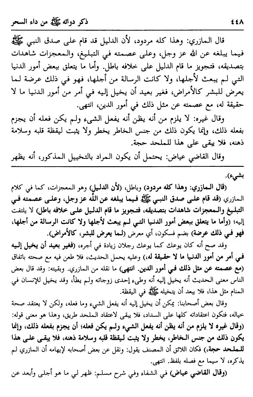 قال المازري: وهذا كله مردود؛ لأن الدليل قد قام على صدق النبي صلى الله عليه وسلم فيما يبلغه عن الله عز وجل، وعلى عصمته في التبليغ، والمعجزات شاهدات بتصديقه، فتجويز ما قام الدليل على خلافه باطل. وأما ما يتعلق ببعض أمور الدنيا التي لم يبعث لأجلها، ولا كانت الرسالة من أجلها، فهو في ذلك عرضة لما يعرض للبشر كالأمراض، فغير بعيد أن يخيل إليه في أمر من أمور الدنيا ما لا حقيقة له، مع عصمته عن مثل ذلك في أمور الدين، انتهى.