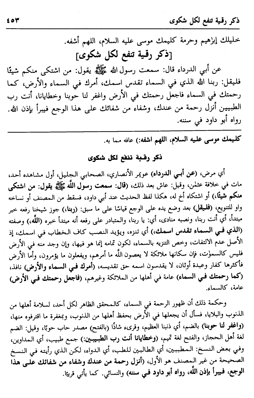 عن أبي الدرداء قال: سمعت رسول الله صلى الله عليه وسلم يقول: "من اشتكى منكم شيئًا فليقل: ربنا الله الذي في السماء تقدس اسمك، أمرك في السماء والأرض، كما رحمتك في السماء فاجعل رحمتك في الأرض واغفر لنا حوبنا وخطايانا، أنت رب الطبيين أنزل رحمة من عندك، وشفاء من شفائك على هذا الوجع فيبرأ بإذن الله". رواه أبو داود في سننه.
