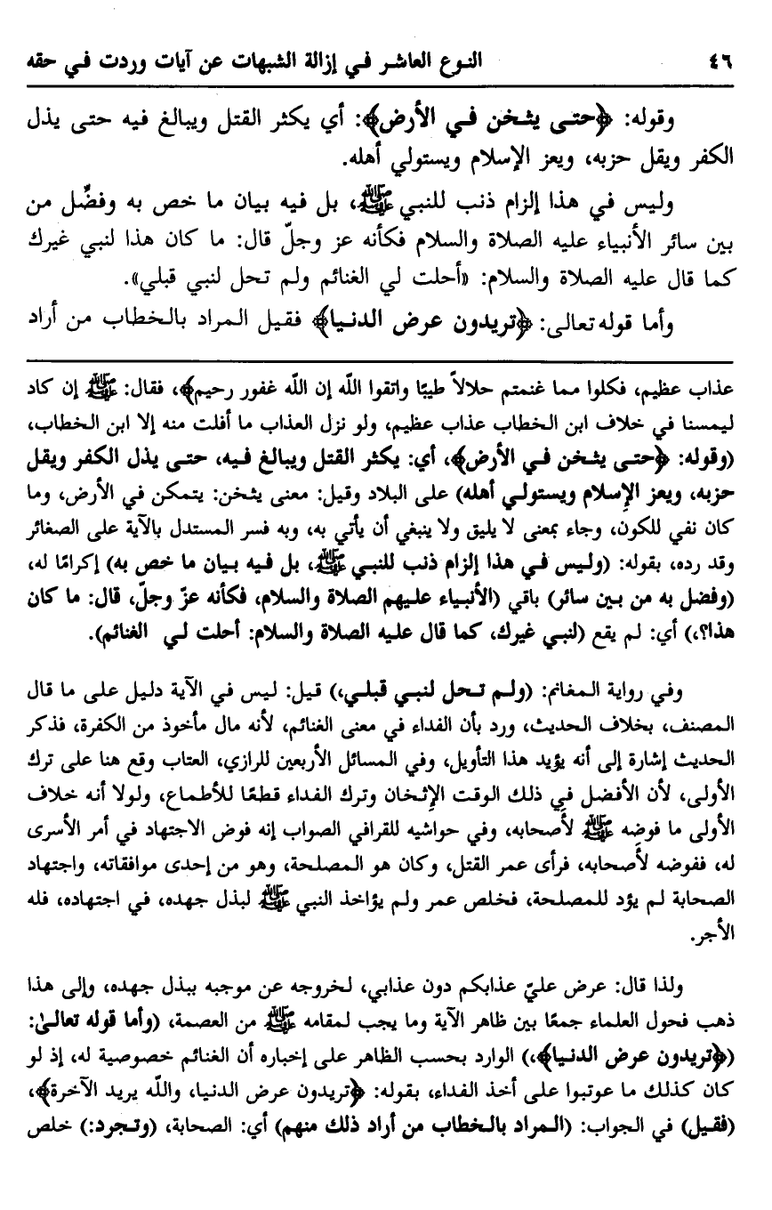ولذا قال: عرض علي عذابكم دون عذابي، لخروجه عن موجبه ببذل جهده وإلى هذا ذهب فحول العلماء جمعًا بين ظاهر الاية وما يجب لمقامه صلى الله عليه وسلم من العصمة، وأما قوله تعالى: {تُرِيدُونَ عَرَضَ الدُّنْيَا وَاللَّهُ يُرِيدُ الْآَخِرَةَ} "فقيل" في الجواب: "المراد بالخطاب من أراد ذلك منهم" أي: الصحابة: "وتجرد": خلص